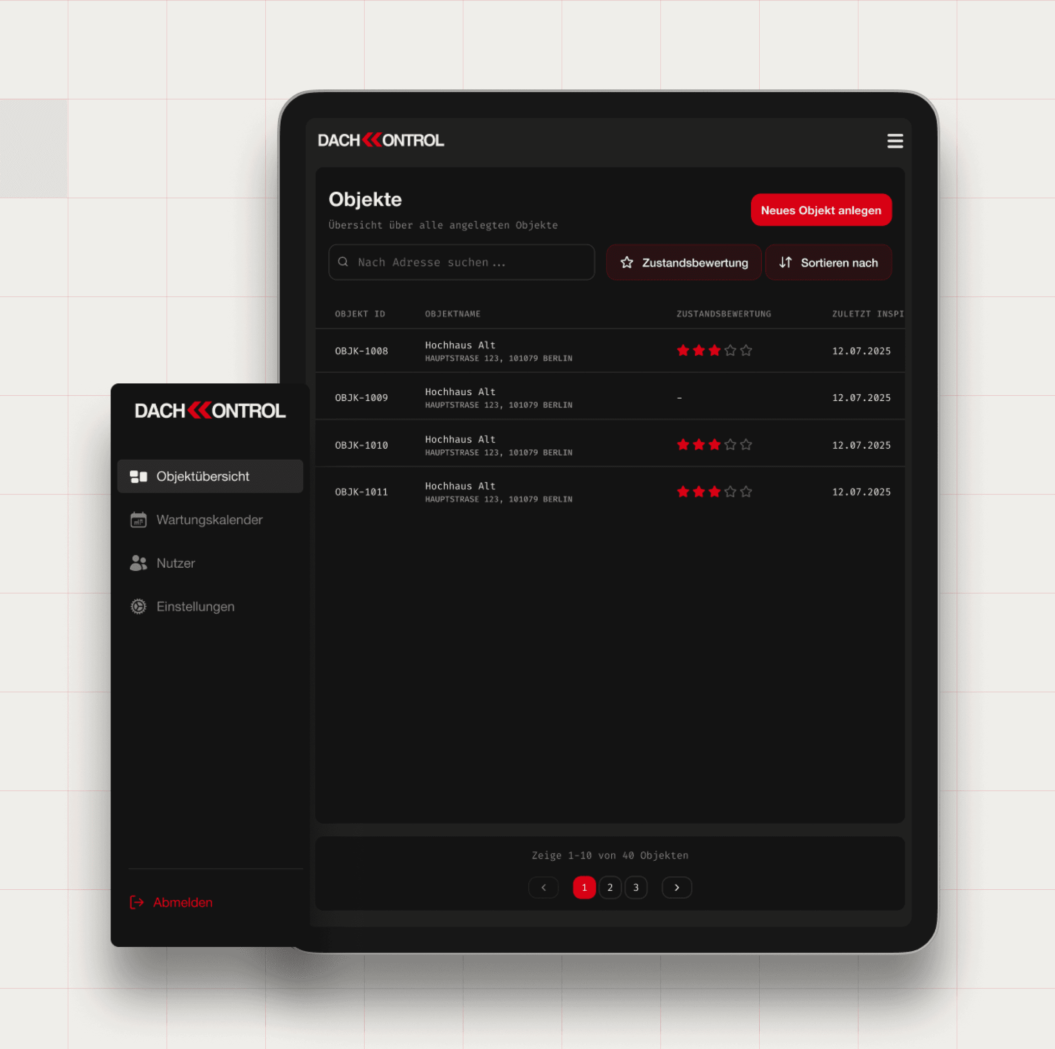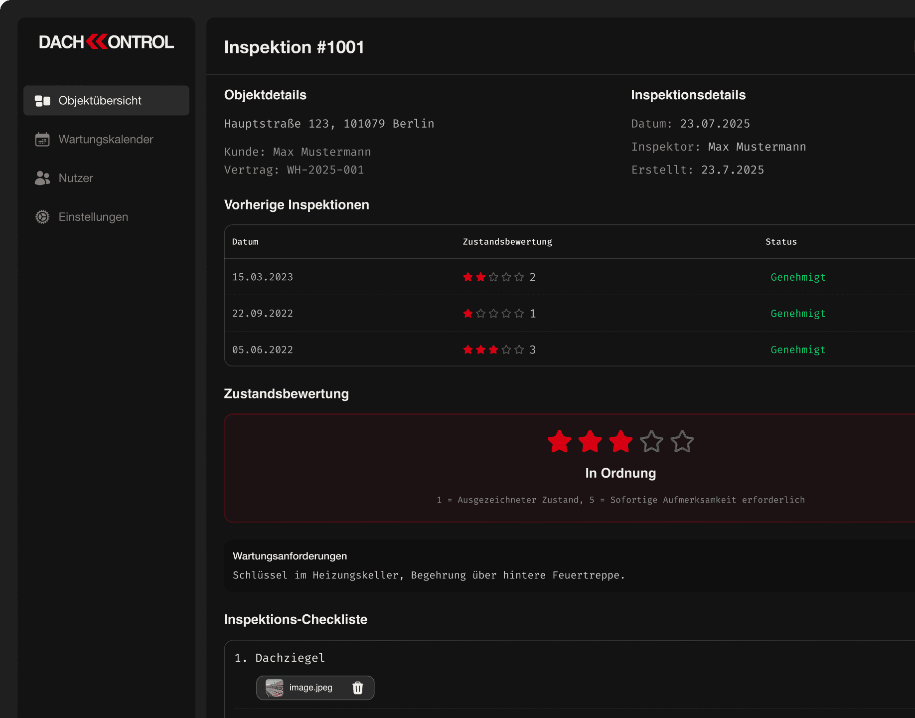 DACH CONTROL reduziert Ihre Kosten für Notfallreparaturen und vermeidet teure Schäden durch fehlende Wartung. Zusätzlich minimieren Sie Haftungsrisiken und erfüllen Versicherungsauflagen. Alle relevanten Stakeholder – Eigentümer, Investoren oder Versicherungen – können per Gastzugang in die digitale Dachakte eingebunden werden. Ergebnis: Planbare Instandhaltung, höhere Gebäudesicherheit, langfristiger Werterhalt.
