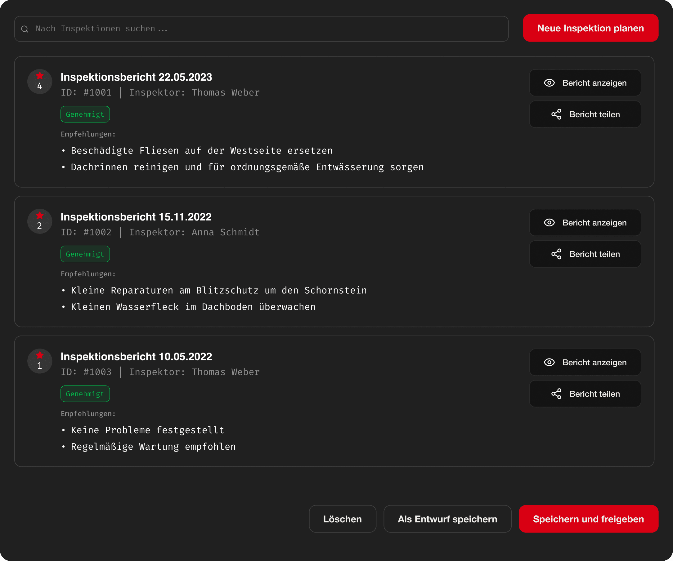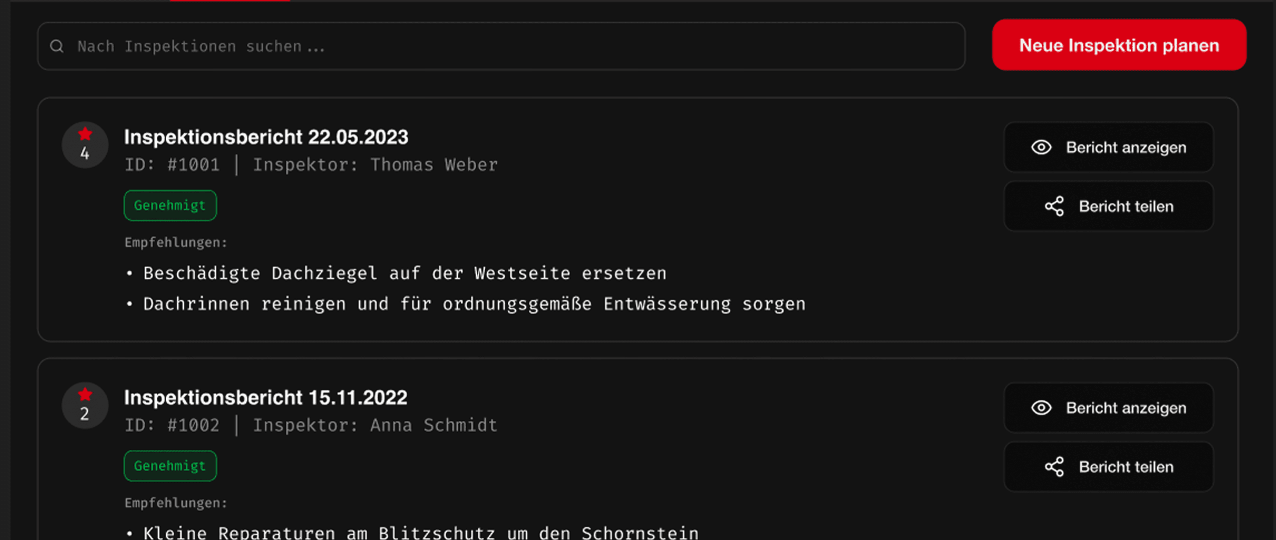 Ohne regelmäßige, strukturierte Inspektionen bleibt der tatsächliche Zustand vieler Dächer unklar. Schäden werden nicht systematisch erfasst oder langfristig nachvollzogen.