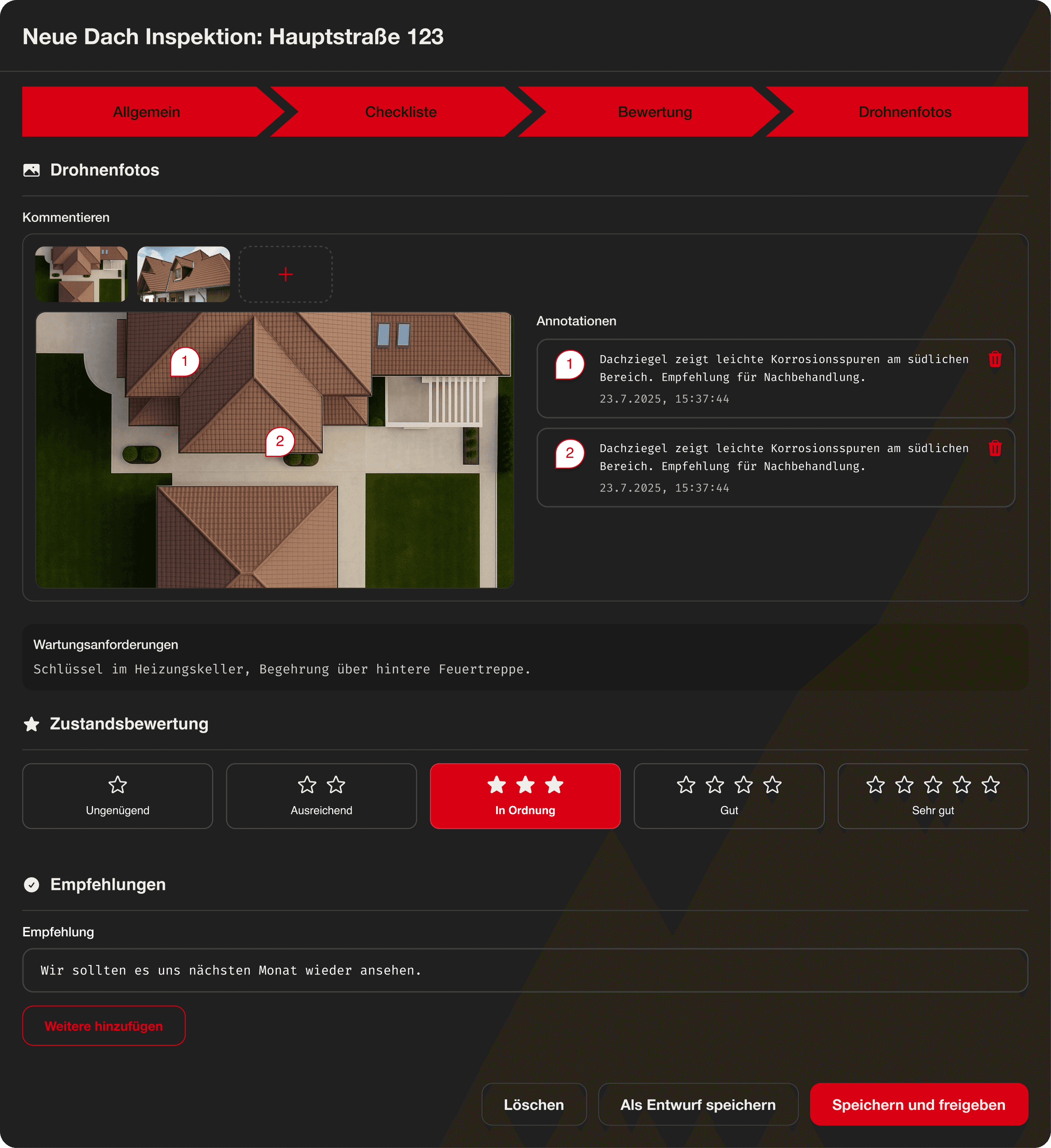 In der DACH CONTROL Dachakte finden Sie: • Hochauflösende Bild- und Drohnendaten • Dokumentierte Wartungs- und Zustandsberichte • Historie aller Inspektionen und Maßnahmen • Handlungsempfehlungen für notwendige Reparaturen Sie erhalten ein vollständiges, digitales Wartungsprotokoll – ideal für Eigentümerversammlungen, Versicherungsfälle oder Investorenberichte.